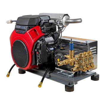 The soft wash system uses low-pressure but high-volume of water mixed with specific detergents for its cleaning power. It is a gentler cleaning method that is ideal for delicate surfaces such as roofs and wood structures. Commercial Honda engine with excellent weight to power ratio. Designed to be used all day, everyday. Gear Drive system lowers the 3500 RPM the engine produces to 550 RPM that the pump operates. High-volume, commercial-grade Comet diaphragm pump has chemical-resistant wet parts that are compatible with aggressive soft wash chemicals. Single piece manifold for reduced leak points and quicker service. Molded insets that cannot come loose. Bolt-on regulator to prevent leaks when adjusting the pressure knob. Aluminum head plates to prevent flexing of the heads. Metal oil cup for impact resistance. The actual product may vary from the images shown on the website. |