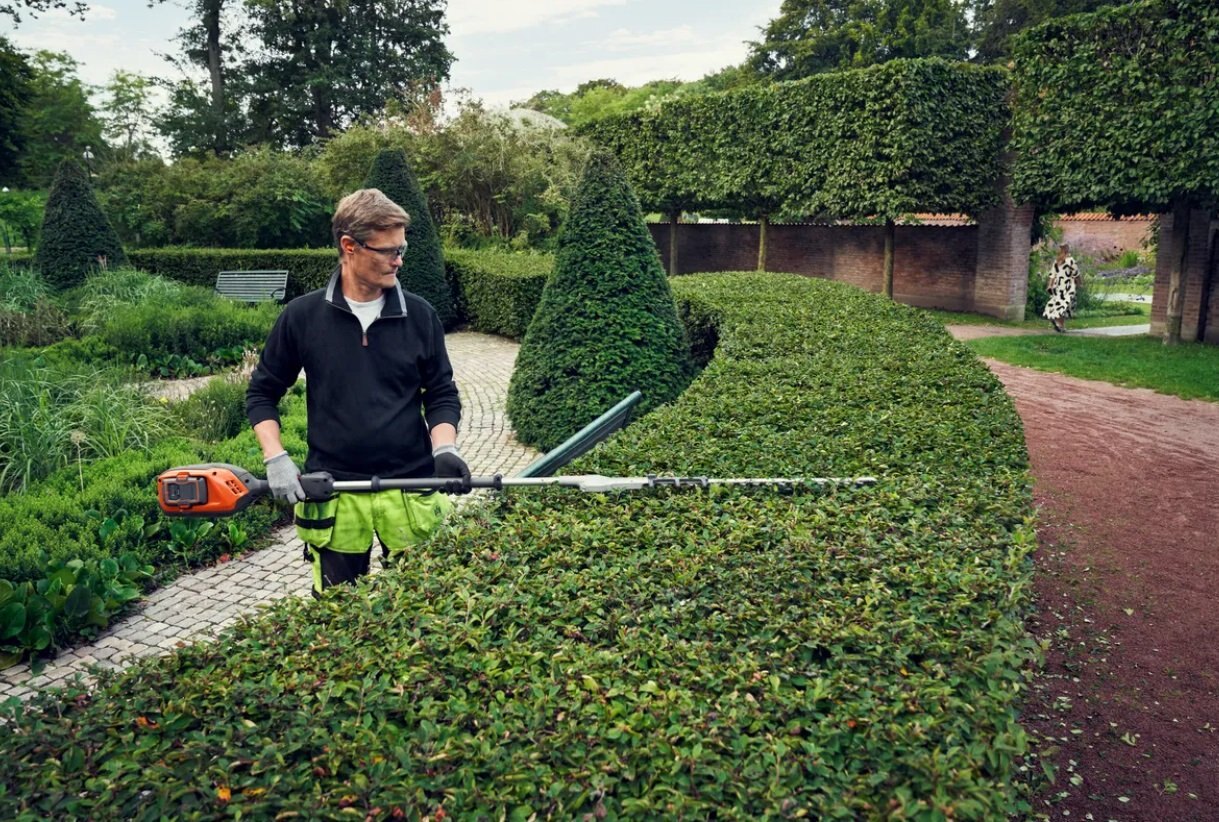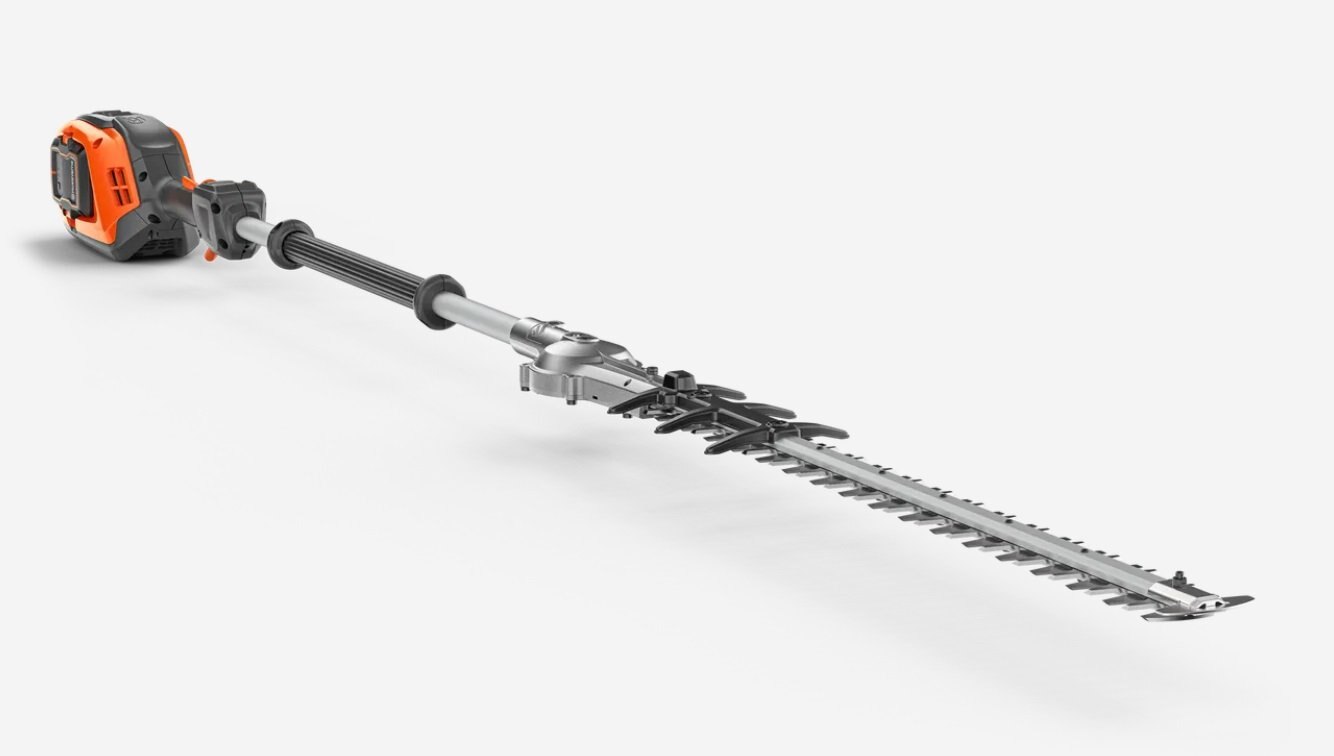 Battery-powered pole hedge trimmer with 3m reach and fixed cutter bar