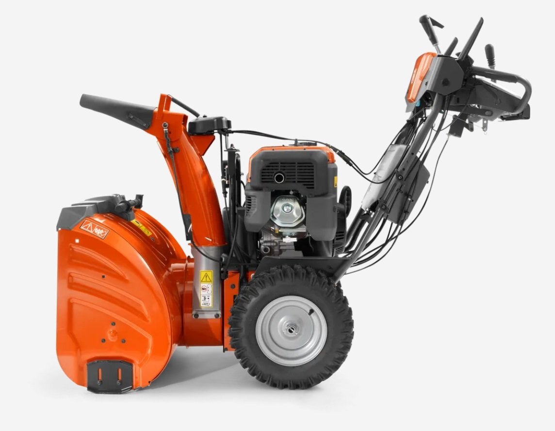 Heavy-duty auger and impeller fan churn through frozen or wet snow with a two-stage clearing system