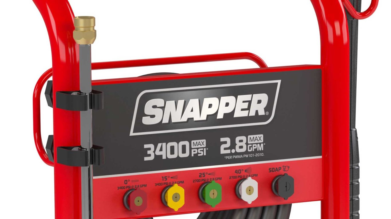 The Snapper® SP3400 Gas Pressure Washer provides the practical power you need for a wide array of cleaning projects including decks, siding, driveways, paint prep and more. Featuring a reliable Briggs & Stratton® CR950 OHV engine and an axial cam pump, this pressure washer provides maximum performance with homeowner-friendly ease-of-use.