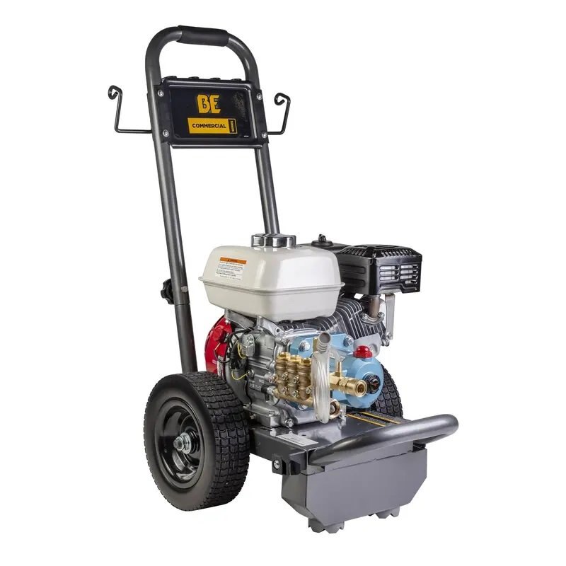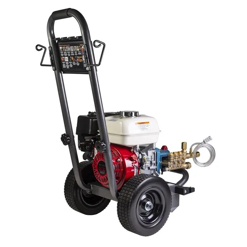 Commercial Honda engine with excellent weight to power ratio. Designed to be used all day, everyday. Direct drive system connects the engine to the pump for a compact and efficient power transfer. Commercial grade compact CAT triplex pump featuring die-cast body, forged brass manifold, ceramic coated plungers and thermal release valve. Built-In unloader effectively regulates water flow in a compact design. Accessories include high-pressure hose, spray gun wand assembly, and spray nozzles so that it can be used right out of the box. Powder coated steel frame with storage for accessories, and 10” flat free tires easily handles going over rough terrain. The actual product may vary from the images shown on the website. |